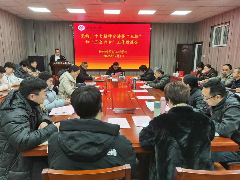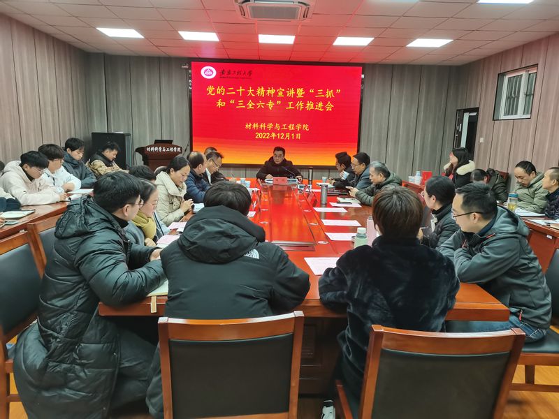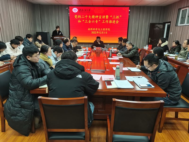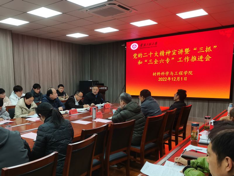 12月1日下午,校党委常委、副校长郑健在校党委常委、组织部部长王弘、校团委副书记、党委学工部副部长李恒奎陪同下,到材料科学与工程学院调研指导“三抓”和“三全六专”工作,宣讲党的二十大精神。学院党政班子成员、党支部书记、系主任,以及学院党政办负责人、组织员、团委书记、本科教学办公室主任、科研秘书、研究生秘书、辅导员、教学督导员,全体团委、学生会主要学生干部,各班班长、团支书参加调研座谈会。