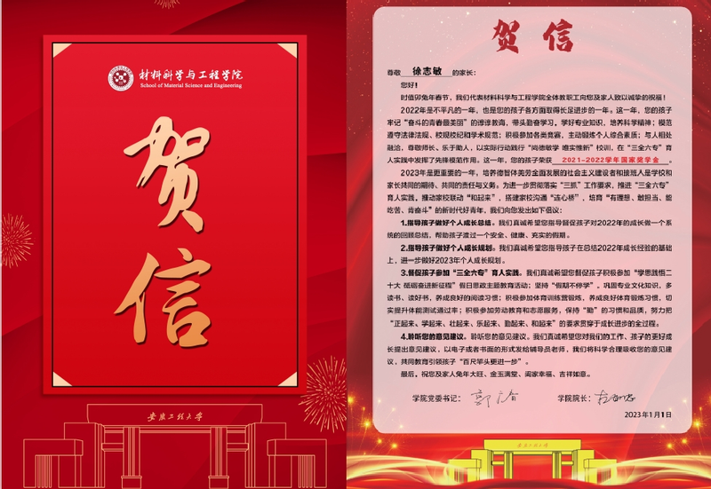 据悉,为了推进家校共建,营造“和起来”的育人实践氛围,材料科学与工程学院专门策划了“给学生家长的一封贺信”活动,详细介绍了学生在校期间的思想动态、获奖情况以及学校的育人政策等,倡议家长在假期指导孩子做好人生规划和总结、督促他们参加“三全六专”育人实践,邀请学生家长积极参与到学院发展建设和育人实践各项工作中,共同做好人才培养工作,促进学生德智体美劳全面发展。