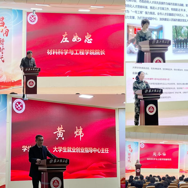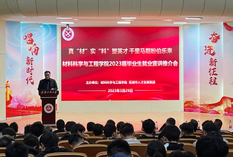 3月29日下午,由材料科学与工程学院、芜湖市人才发展集团联合举办的2023届毕业生就业宣讲推介会在学术报告厅举行。校党委常委、副校长郑健,校学生处处长、大学生就业创业指导中心主任黄炜,芜湖市紫云英人才服务公司总经理宋丽丽,学院产业教授、安徽众源新材料股份有限公司副董事长兼副总经理吴平、国家智能铸造产业创新中心总经理宋亮,瑞鹄汽车模具股份有限公司技术总监张威,校征兵工作站负责老师赵成婧应邀出席。会议由学院党委书记郭广春主持。