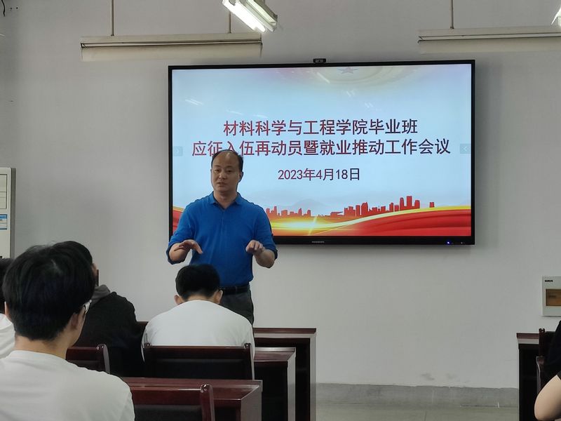 为持续推进2023届毕业生就业和应征入伍工作,4月18日上午,材料科学与工程学院在B203会议室举办毕业班应征入伍再动员暨就业工作推进会,校征兵工作站赵成婧老师应邀进行入伍再动员。院党委副书记方玖胜、毕业班辅导员周冬梅和2023届毕业班未就业学生参加此次会议。