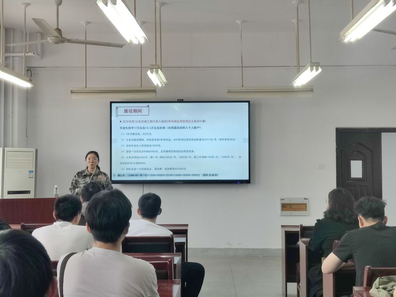 会上,赵成婧从大学生征兵入伍条件、大学生入伍优惠政策、征兵入伍基本流程几个方面详细向毕业生们介绍应征入伍相关内容和注意事项,分享我校已入伍学生代表的成长发展情况,并号召身体素质过硬的应届毕业生报名应征入伍,早日加入保家卫国事业中。方玖胜通报了学院考研录取情况以及截止目前毕业生去向落实率,分析了毕业生就业过程中存在的问题,希望大家要高度重视,紧紧抓住当前就业最佳时机,我们共同完成就业目标。为确保毕业生高质量就业,学院构建领导包班、系主任主抓、辅导员抓具体、毕业设计指导教师具体抓的就业工作格局,层层压实就业责任。学院建立一对一就业帮扶机制力促就业,毕业设计指导教师与未就业毕业生精准对接,深入了解学生的就业诉求,用心、用情说服学生积极主动的参与到应聘之中,积极联系企业并推荐就业岗位,将工作做专做细做到位。