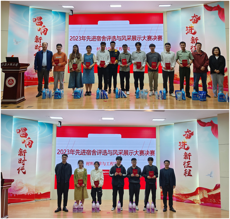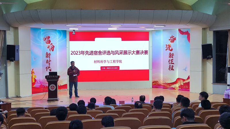 为进一步落实“三全六专”育人实践工作,围绕“勤起来”,扎实推进宿舍新态建设,打造和谐、干净、文明的宿舍环境,5月24日,材料科学与工程学院在学术报告厅举办2023年宿舍评选与风采展示大赛决赛,学生处副处长杜松涛应邀担任评委并点评,学院党委副书记方玖胜、校团委副书记王鸣鹃、校后保处宿舍管理中心主任洪飞、材料学院团委书记陶冶老师担任评委,全院各班生活委员和寝室长到场观赛。