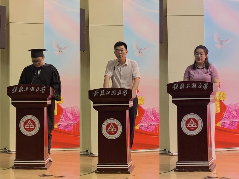 随后毕业生代表材科192班张玉宝发言,与所有毕业生共同回忆了大学四年的美好时光,并向辛苦教导培育的老师们表示衷心感谢;毕业生家长代表材控192班井义晨同学的父亲感谢院校领导和各位老师对同学们的付出,向即将走出校园的同学们表示祝贺,祝福同学们在未来的人生新篇章中实现理想,不负青春,不负韶华;教师代表蒋雪雯送上了对毕业生的深情嘱托和美好祝愿,希望学生们永葆一颗平常心,活得快乐、学会感恩、学会坚强。