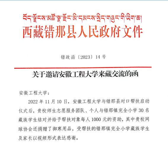 近日,西藏错那县人民政府专程发来交流邀请函,对我校师生为错那镇完全小学30名藏族学生们开展的公益资助捐赠活动表示感谢,并诚挚邀请我校师生赴错那县开展交流访问活动。