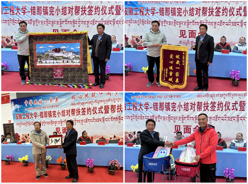 郑健一行在错那县人大主任次仁、副县长张宗宝、教育局局长王俊锋、安徽省第八批援藏干部程志昆等人陪同下参观考察并听取错那县经济社会发展、守边固边以及基础教育建设情况介绍,在错那镇完小举行安徽工程大学-错那镇完小结对帮扶签约仪式暨帮扶对象见面会。郑健代表学校党委行政讲话、与错那镇完小校长仁增签订友好共建协议、接受错那镇完小师生向学校捐赠的礼物和荣誉证书、与受资助的藏族学生互动交流。