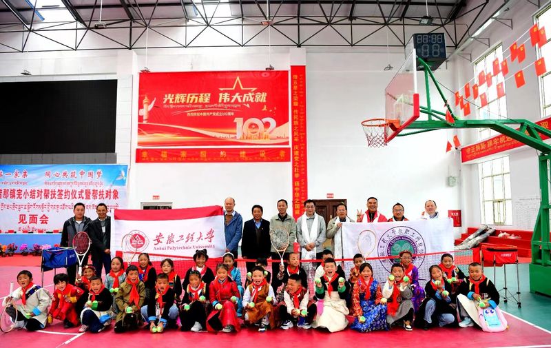 郑健简要介绍学校基本情况、结对帮扶前期筹备情况。2022年11月以来,由校友会秘书处、校工会、校团委牵头,材料科学与工程学院公益“N+1”志愿服务团队具体对接,我校师生校友开始结对帮扶错那镇完小30名藏族学生,共计捐赠帮扶资金6万元以及价值约1万元的御寒、运动装备物资。接下来,安徽工程大学将结合自身实际,努力推动教育帮扶向产业帮扶、技术帮扶扩展,探索“资助结对+特色教育+双向互动”的帮扶路径。校友会秘书长陶玉贵代表学校向错那镇完小捐赠了3万元现金和芜湖铁画。校教职工网球协会活动推广人周毅仁向错那镇完小赠送了由校工会教职工网球协会捐赠的网球运动用品并现场教授网球知识。