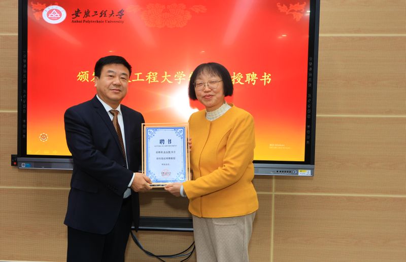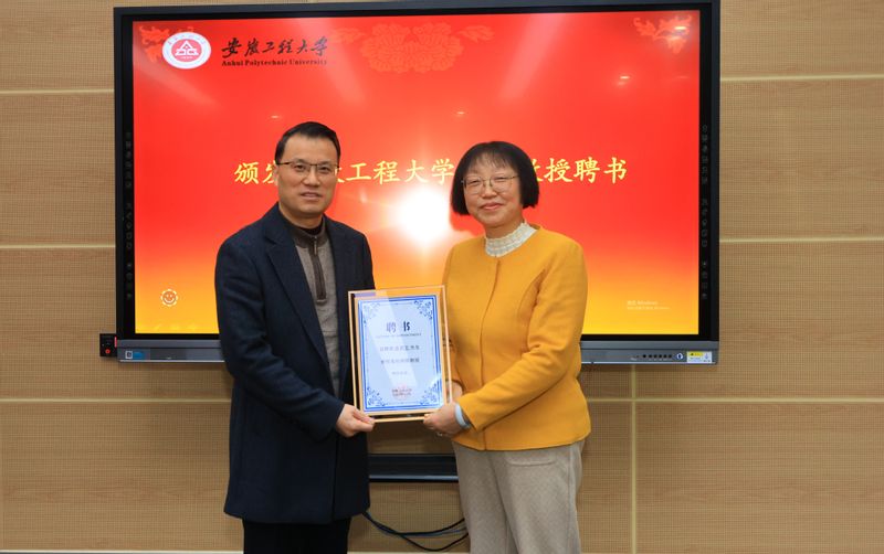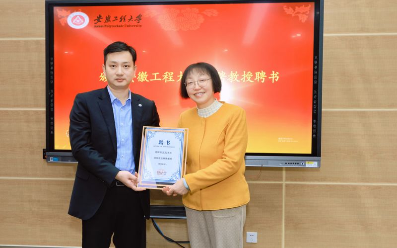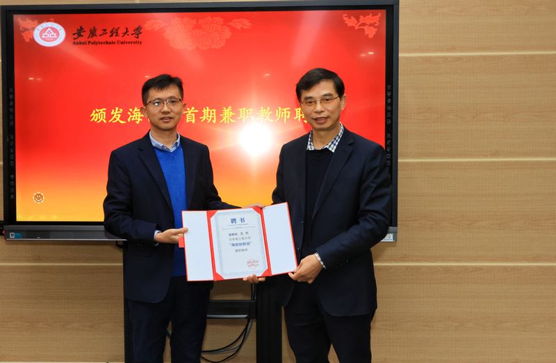 周虹屏向疏茂等4名企业高管颁发“安徽工程大学特聘教授”聘书。社会合作处处长刘金斌为“海创班”兼职教师颁发了聘书。
