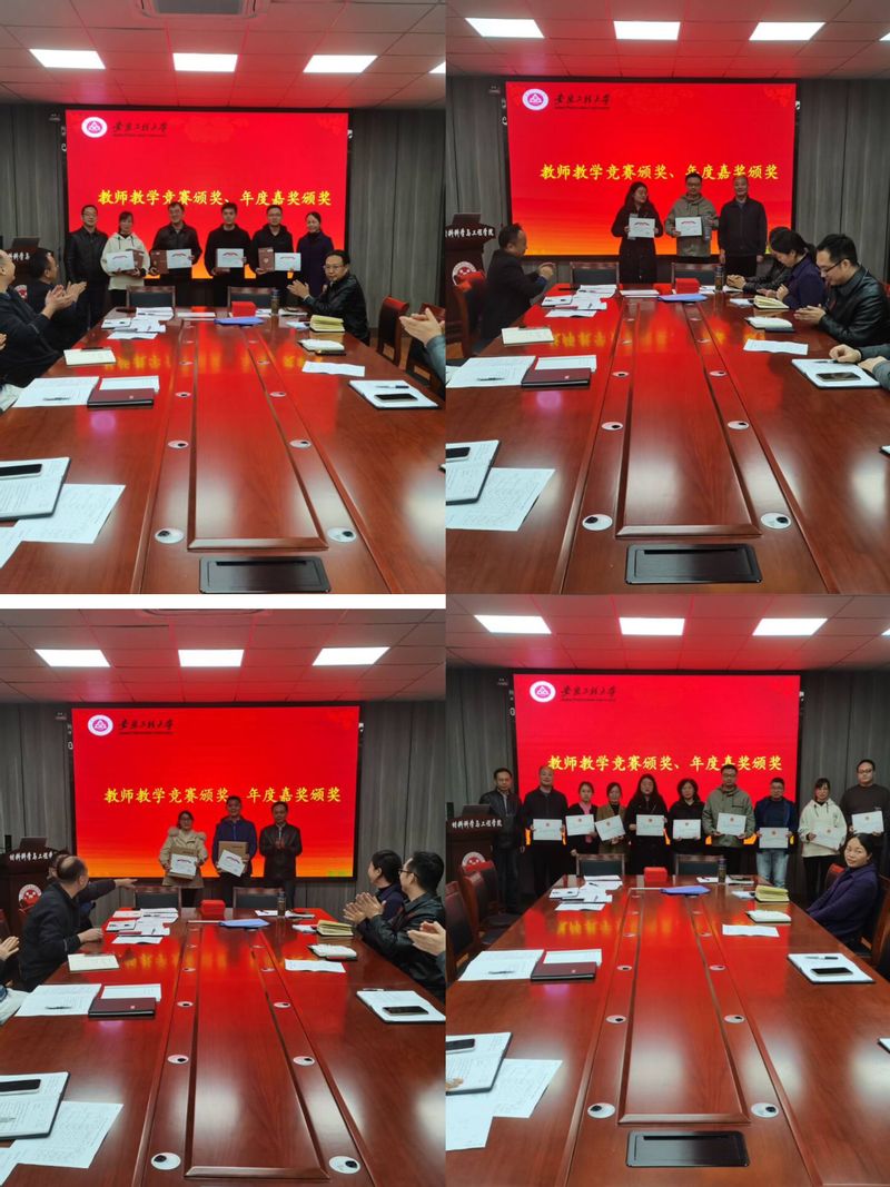 在表彰奖励环节。学院领导为获得2023年学院教师教学竞赛一二三等奖的老师颁发了证书和奖品;为获得学校2022年度嘉奖的老师颁发了证书。