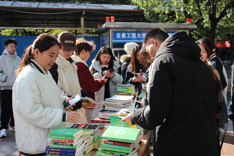 初冬的校园虽带着几分寒意,但义卖活动现场却暖意融融。上午9时活动正式启动,志愿服务队成员提前布置的摊位前很快便聚集了前来选购的同学,3小时的活动期间始终人气不减、氛围热烈。摊位上的书籍经过志愿者们的分类整理,整齐陈列着四六级单词手册、历年真题集、专项习题册等备考资料,部分书籍内还夹着学长学姐手写的复习笔记和重点标注,成为吸引选购者的“特色亮点”。