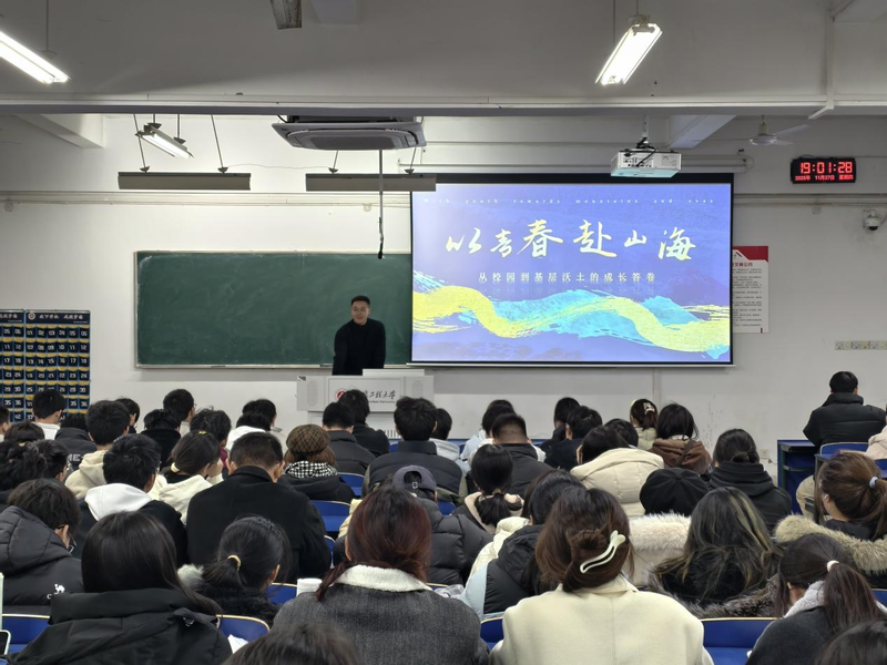 在“西部计划:从忐忑不安到学有所得”的分享中,王鑫校友卸下“榜样光环”,坦诚讲述了初到基层时面对陌生环境的迷茫、处理复杂工作的挑战,以及在一次次实践中找准定位、实现价值的蜕变过程。在“基层邀约”环节,他以“青春不止一种活法”为切入点,结合国家乡村振兴、西部大开发等战略需求,向新生们展现了基层舞台的广阔前景,呼吁大家拓宽职业视野,把基层作为淬炼成长的“练兵场”。他分享的三点寄语更是直击人心,引发全场共鸣:“青春最大的资本是试错的勇气,要在主动探索中明晰方向;职业选择当遵从内心热爱,让初心成为前行的指南针;基层工作需兼具‘钝感力’与韧性,唯有坚守方能收获成长。”