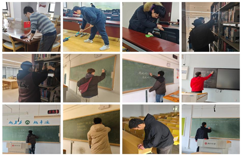 随后,党员队伍前往四号教学楼,对教室地面、黑板、桌面等进行清扫。劳动现场,同志们热情高涨、干劲十足,不怕脏、不怕累,每一个动作都尽显担当,成为校园里一道靓丽的风景线。