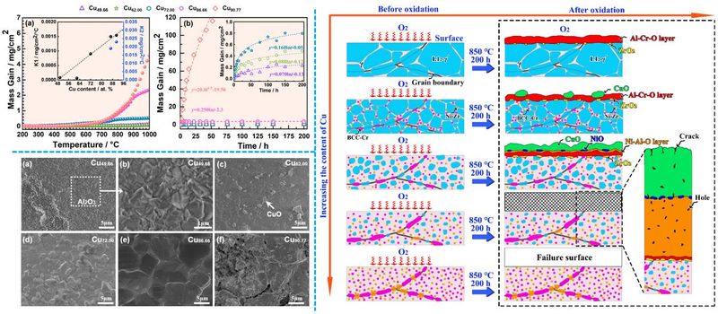 开发具有优异抗氧化性和高热稳定性的先进铜合金对于关键热端部件的应用至关重要。基于此,该工作系统研究了Cr和Zr共添加对共格析出强化耐热Cu-Ni-Al合金微观结构和氧化行为的影响。通过微观结构表征、热力学计算和第一性原理计算,阐明了其微结构演变和抗氧化机制。研究结果指出,Cu49.66合金中Cr-Ni和Zr-Ni间的强焓交互作用使得两元素完全固溶在γ和γ′相中。随着Cu含量的增加,γ′相的体积分数和尺寸减小且过量的Cr和Zr分别以BCC-Cr和Ni5Zr相析出。当Cu含量小于86.66 at.%时,合金表现出优异的抗氧化性能,850℃高温条件下氧化增重仅为0.22–3.54 mg/cm²。这种优异的抗氧化性能一方面来源于Cr促使氧化铝保护层更致密和Zr阻碍氧的晶界扩散通道作用;另一方面来源于具有高氧吸附能的BCC-Cr和Ni5Zr相加速了保护性氧化膜的形成。该研究为高温耐热铜合金的成分设计和抗氧化应用提供了理论和技术支撑。