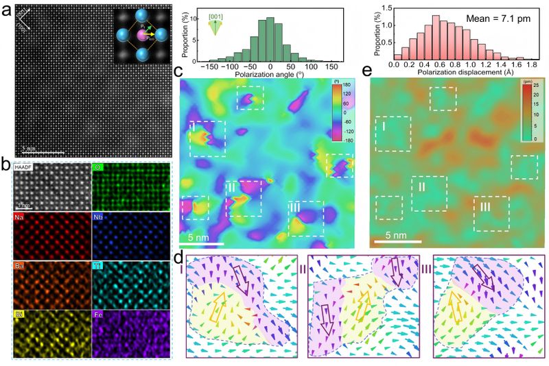 图1 (Bi0.2Na0.2Ba0.2Sr0.2Ca0.2)(Ti0.94Sn0.06)O3陶瓷多级电畴结构表征
