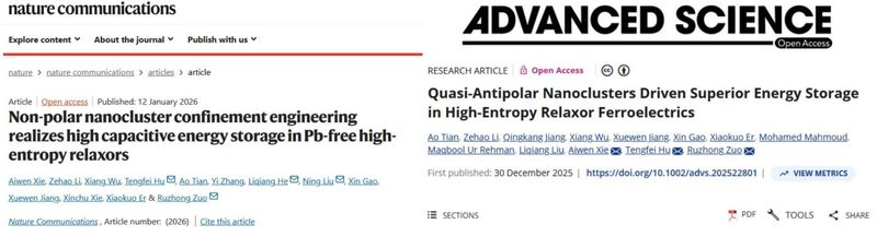 Aiwen Xie, Zehao Li, Xiang Wu, Tengfei Hu*, Ao Tian, Yi Zhang, Liqiang He*, Ning Liu*, Xin Gao, Xuewen Jiang, Xinchun Xie, Xiaokuo Er, Ruzhong Zuo*. Non-polar nanocluster confinement engineering realizes high capacitive energy storage in Pb-free high-entropy relaxors, Nature Communications, 2026, in Press.