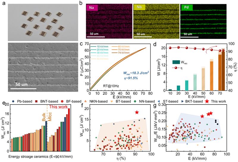 发表于《Advanced Science》的研究则以反铁电/铁电共存的NaNbO3陶瓷为基体,通过高熵组成设计,在弛豫铁电体中构建出“准反极性纳米团簇”结构。该结构不仅削弱了周围极性纳米微区之间的耦合,还在外加电场下表现出不同于极性纳米微区的相变行为,从而实现了低滞后、类线性的极化-电场响应。最终制得的NaNbO3基无铅MLCC原型器件具备优异的综合储能性能:储能密度为~18.3 J·cm-3,储能效率约91.5%,储能密度/测试电场比值达0.25 J/(kV·mm-5)。