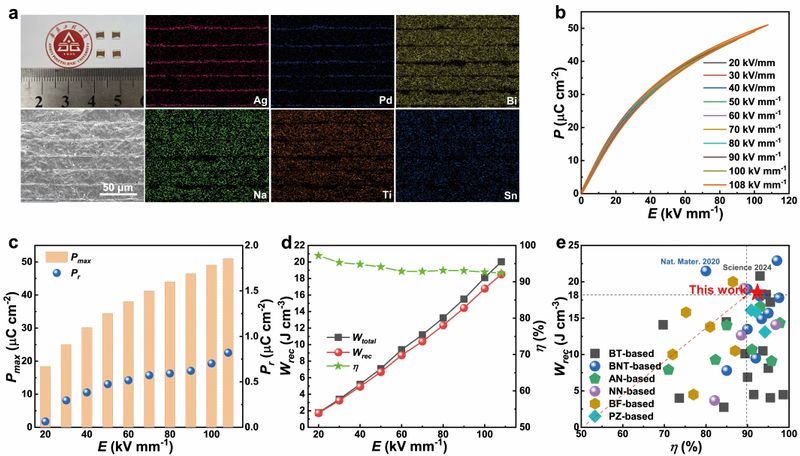 近日发表于《Nature Communications》的研究通过相场模拟指导,设计出 (Bi0.2Na0.2Ba0.2Sr0.2Ca0.2)(Ti1-xSnx)O3无铅高熵驰豫铁电体,并提出一种“非极性纳米团簇约束工程”策略以优化其储能特性。引入低离子极化率的Sn4+促使形成局域非铁电钙钛矿单胞,这些单胞构成坚固的非极性纳米团簇,并在高熵构型固有的强局域随机场作用下进一步稳定。这些团簇可作为有效钉扎中心,抑制电场下极性纳米微区的合并与生长,从而缓解极化增强与滞后减小之间的矛盾。基于最优组分(x=0.06)制备的多层陶瓷电容器(MLCC)原型器件展现出~18.5 J·cm-3的高储能密度以及约92.4%的高储能效率,在无铅储能陶瓷材料中呈现出具有竞争力的性能组合,为未来高储能电介质材料的开放提供了理论和实践指导。