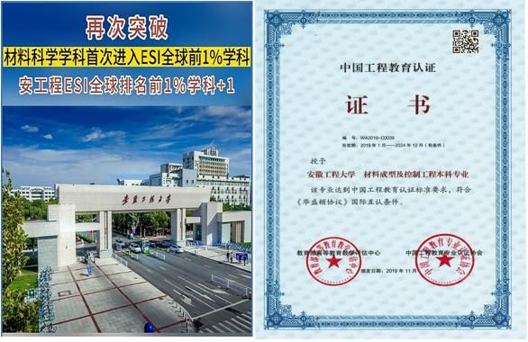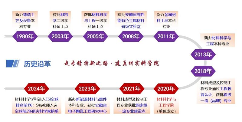 材料科学与工程学院本科教育肇始于1980年安徽机电学院机械系铸造工艺及设备专业,2020年7月由原机械与汽车工程学院材料科学与工程系独立建院。2003年,获批“材料学”二级学科硕士点;2005年获批“材料科学与工程”一级学科硕士点;2008年,获批“安徽省先进有色金属材料重点实验室”;2018年,“材料成型及控制工程”入选“安徽省一流(品牌)专业”并通过工程教育专业认证;2021年,“材料成型及控制工程”获批国家级一流专业建设点;2023年,获批“安徽省电子陶瓷工程研究中心”;2024年,材料科学学科进入ESI全球排名前1%。